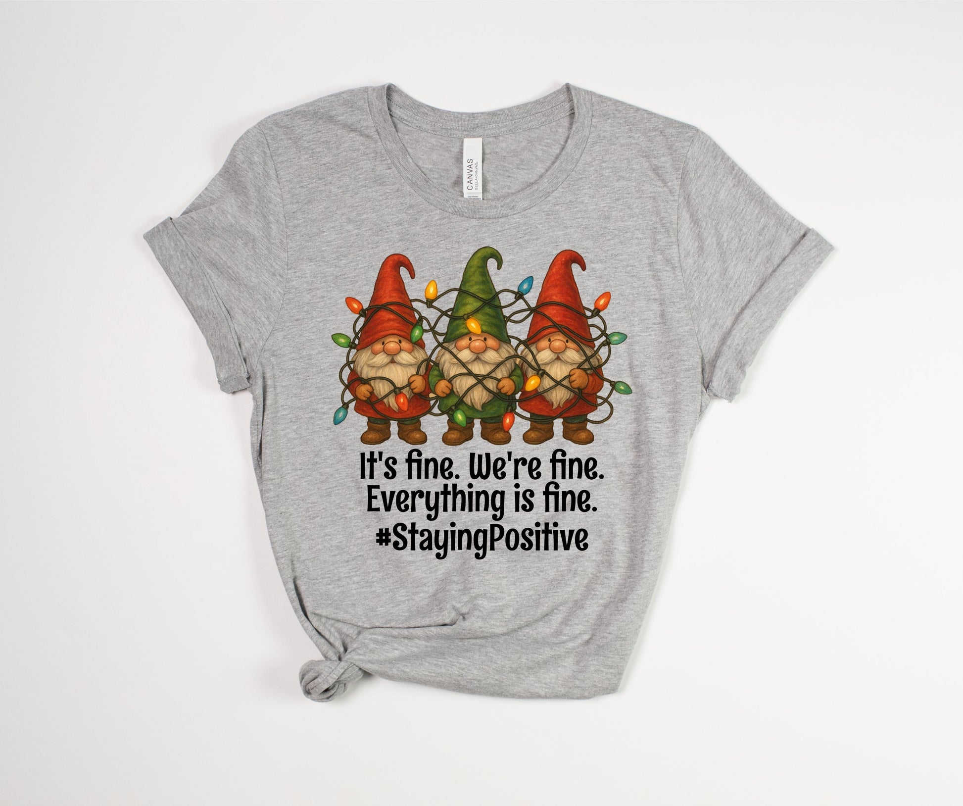 Bring some festive truth to your wardrobe with this playful tee featuring three Christmas gnomes helplessly tangled in twinkling lights. Their cheerful struggle pairs perfectly with the phrase “It’s Fine, We’re Fine, Everything is Fine #StayingPositive,” making this shirt the ultimate mood for the season.