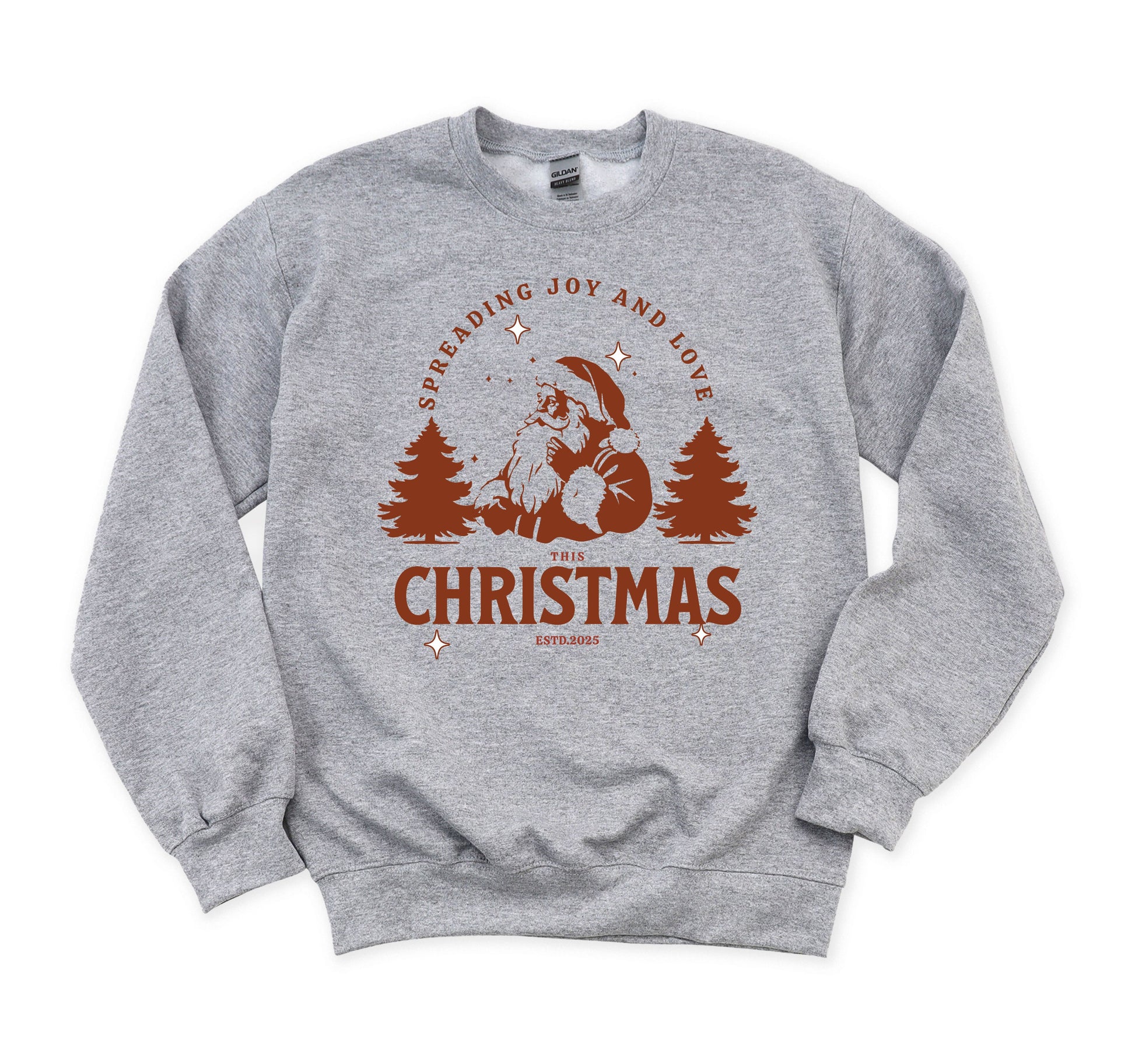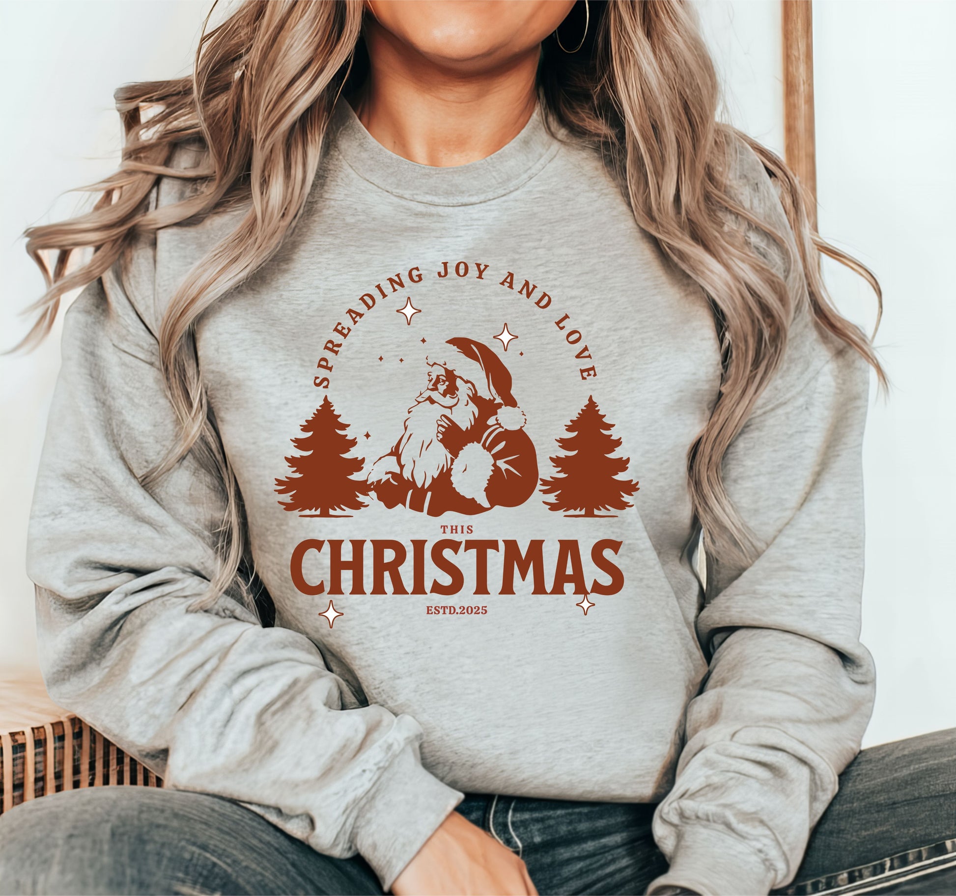 Share the warmth of the season in the coziest way with this charming crewneck sweatshirt. Featuring the uplifting phrase “Spreading Joy and Love This Christmas” along with a cheerful Santa and festive Christmas trees, this sweatshirt captures everything we adore about the holidays—kindness, joy, and a little bit of magic.