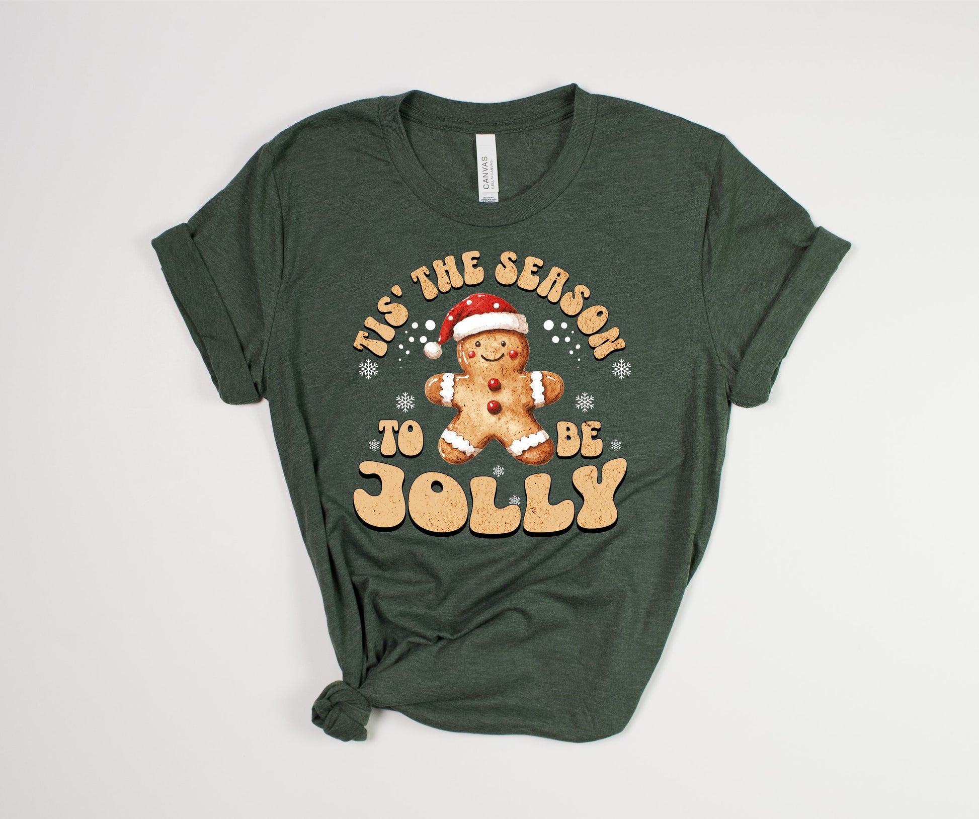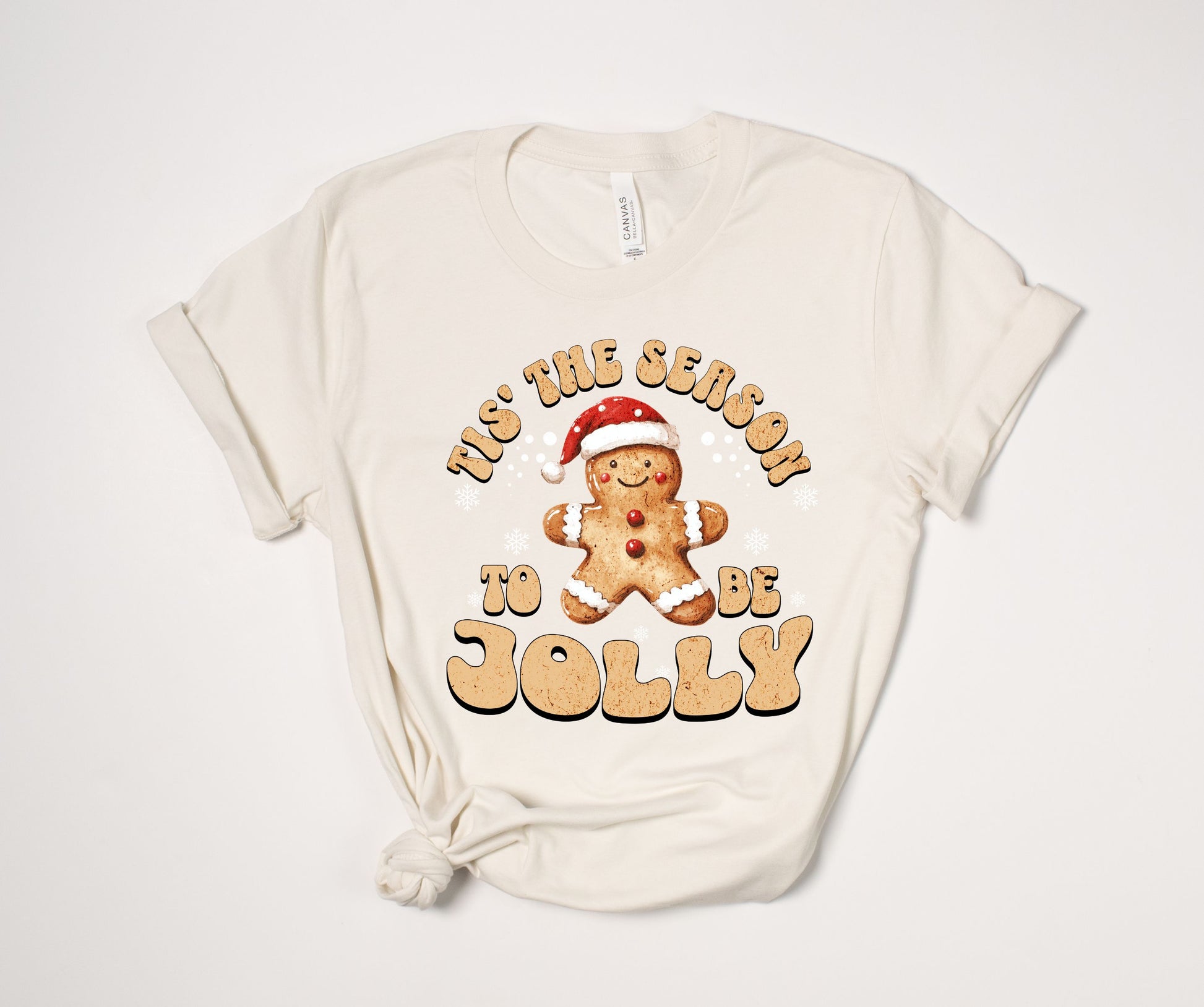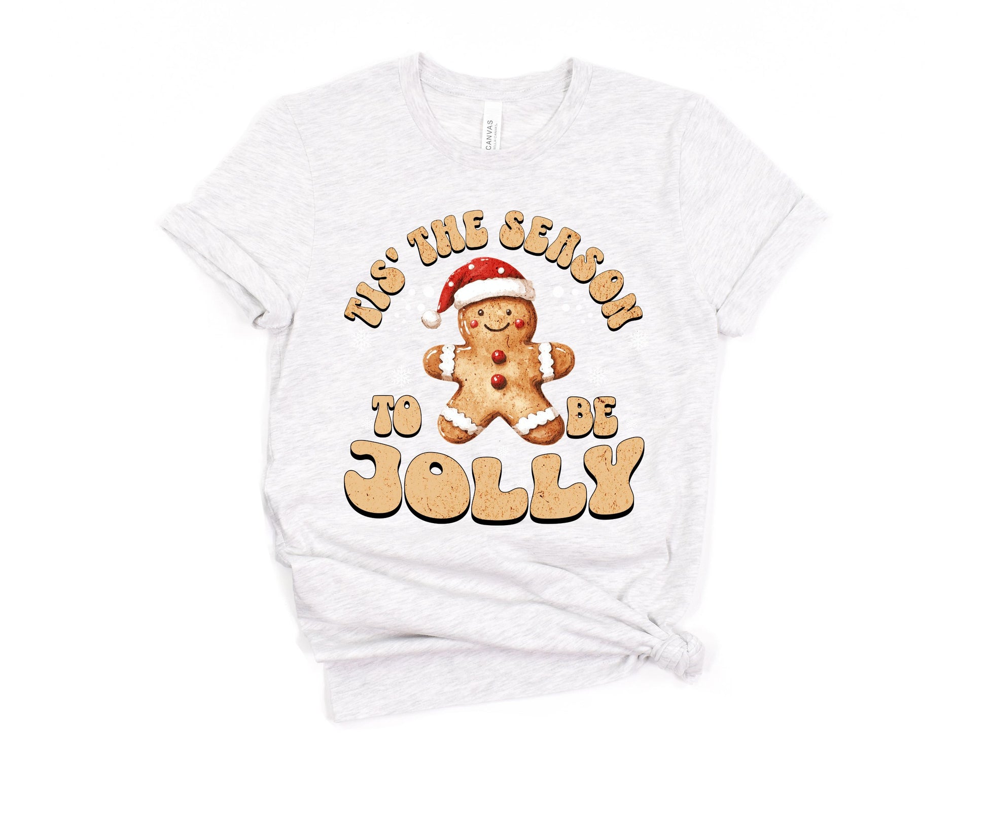 Sweeten your holiday style with this tee featuring an adorable gingerbread man surrounded by the classic phrase “Tis the season to be jolly.” It’s the perfect blend of festive charm and comfy everyday wear.